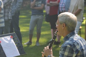 Gelukkig was de sfeer – na de ‘officiële entree’ – ongedwongen en spontaan. Met een korte beschouwing en enkele mooie liederen opende Janny, onder muzikale begeleiding van Ad en met enige hulp van de Markies en zijn lakei, het Sint Jan feest. Lukas had voor een knapperig vuurtje gezorgd waar traditioneel enkele dapperen overheen sprongen.