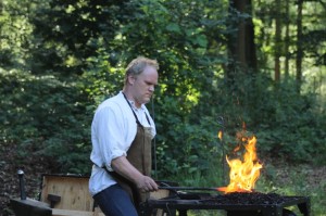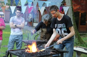 Van bij de aanvang van het feest bracht de ‘smidse’ onder leiding van Bart volop sfeer; Dominique genoot met volle teugen en ook Lex liet zich niet onbetuigd. De andere workshops, zoals kruidenzakjes maken, het ontwerpen van een schelpenmandala, broodjes bakken boven het vuur, boogschieten, werken met klei … konden, na een rustige start, op veel belangstelling rekenen.